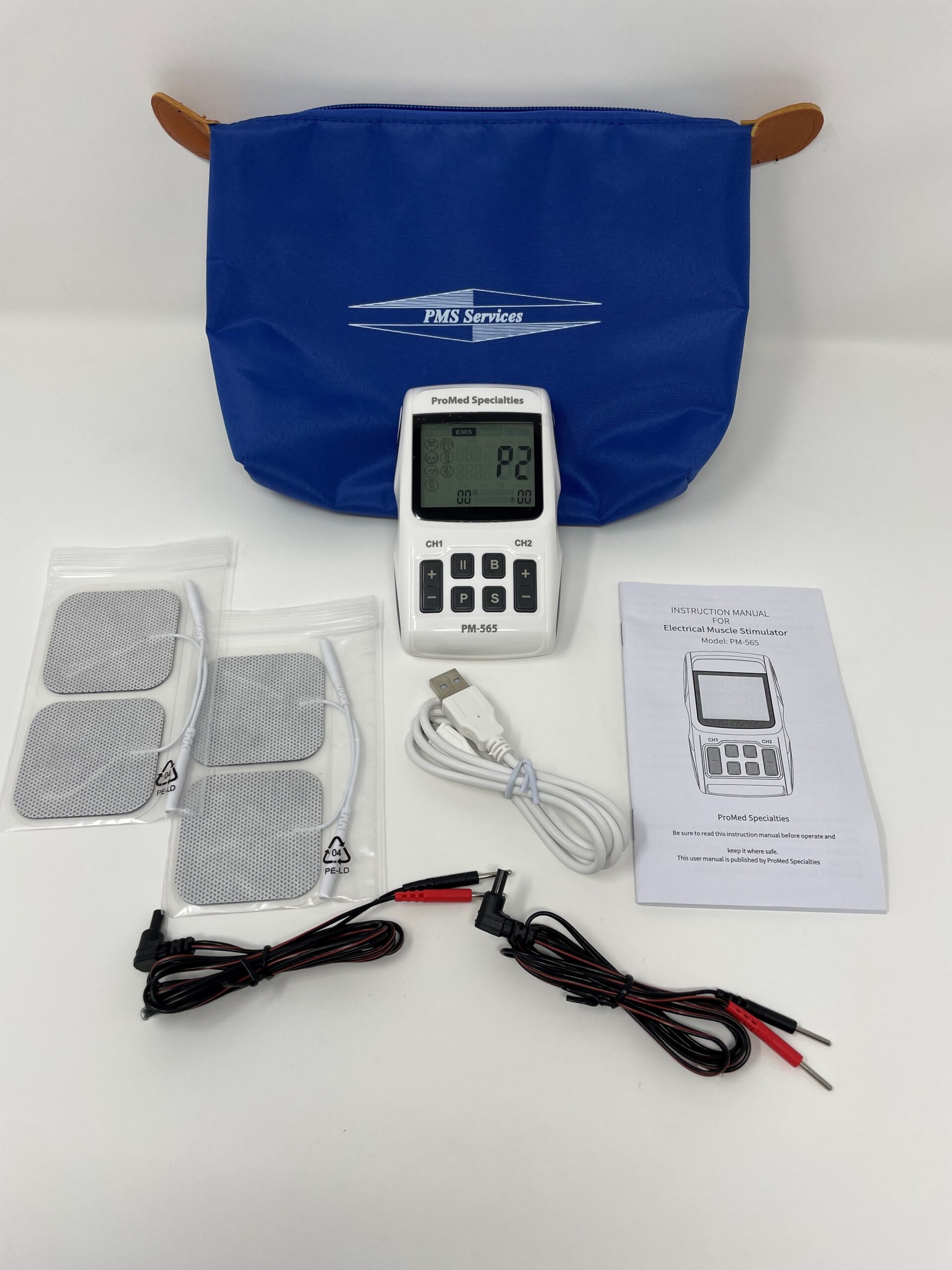 PM-565 EMS Unit, A pack of 4 2X2 Electrodes, A set of 2 lead wires, charging cord, manual, and comes in a blue bag carrying case to protect your unit.