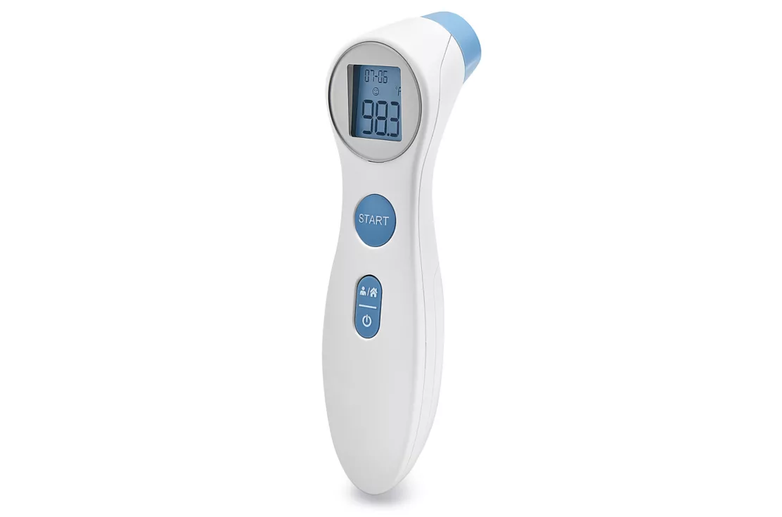 Infrared thermometers project a light beam to measure body temperature at the forehead without touching the skin. Also known as noncontact IR thermometers, they deliver an instant reading